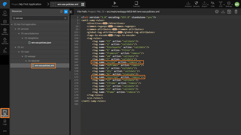 /src/main/webapp/WEB-INF/wm-xss-policies.xml. The default policy file iswm-xss-policies.xml. According to this default policy file, script tags will be removed. However, you can upload your own policy file which will be uploaded to WEB-INF folder. Clicking on to the file name will open it in the editor. Go through the document for more descriptions on AntiSamy rules.