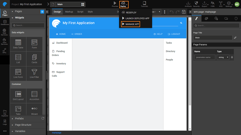 - By using the Manage App option under Deploy from the Project Workspace Main Menu - this will open the app for management.