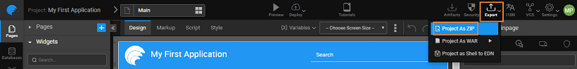 - Export Project allows you to create a ZIP or a WAR file including the project along with the resources used. The projects are Maven compliant.