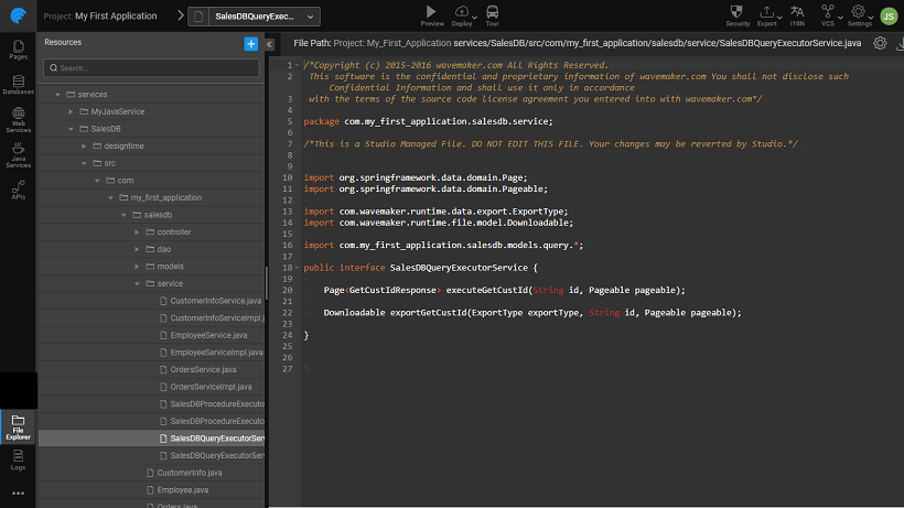 There will be times when you want to display data from multiple tables or update/insert values into multiple tables. Queries and Stored Procedures come in handy in such instances. WaveMaker provides editors for Queries & Procedures for integrating them with the WaveMaker applications. Each query & procedure used in the WaveMaker application will be exposed as a REST API for the UI to consume and render the data.