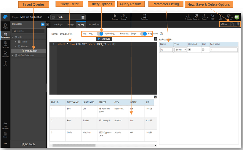 - The queries can be in HQL or Native SQL. These queries can be saved and used via the Database APIs generated.