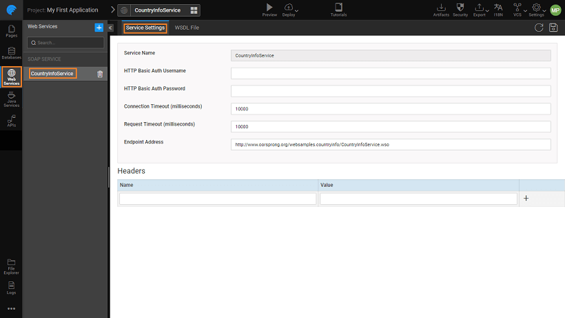 WSDL SourcetoURLand enter the URL of the WSDL, for example:http://www.oorsprong.org/websamples.countryinfo/CountryInfoService.wso?WSDL - File: Toggle