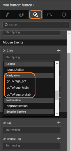 Binding the Navigation Action to a Widget event - For example Button click – Use the button’s onClick event to trigger a Navigation Action to move to a new page or view.