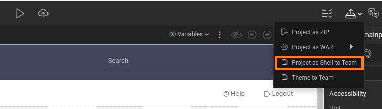 Team version: Once the developer exports a project as Shell to Team, they will be prompted to enter the publishing information, see Artifact features for more information. The Team Admin has to approve or reject the Shell as with any other Artifact. Once approved, developers can select the Shell when creating new projects.