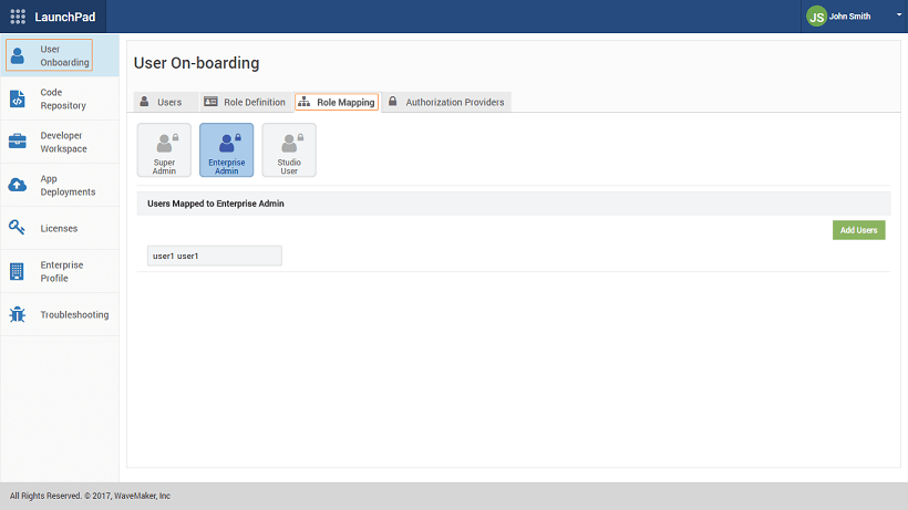 From the Role Mapping tab users can be assigned to Super Admin, Enterprise Admin and Studio User.