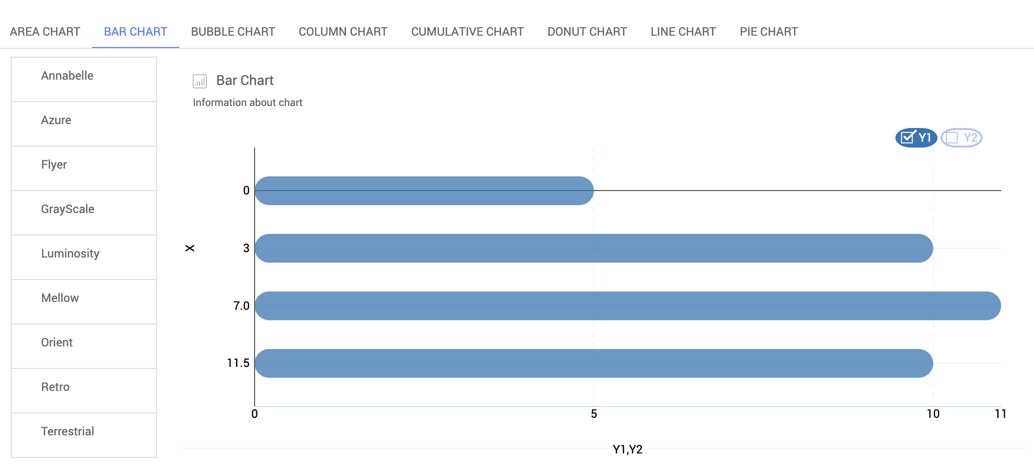 - The theme for charts can be chosen from a list of options.