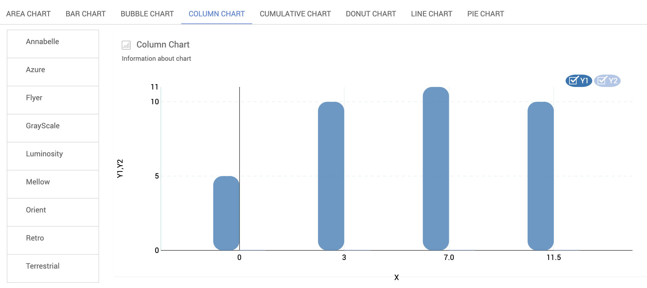 - The theme for charts can be chosen from a list of options.
