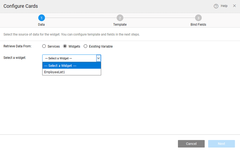 There can be different scenarios to deal with when configuring your Cards Widget with a data source. The data source can be in the form of a service - database, web or Java; or from an another widget on the page.