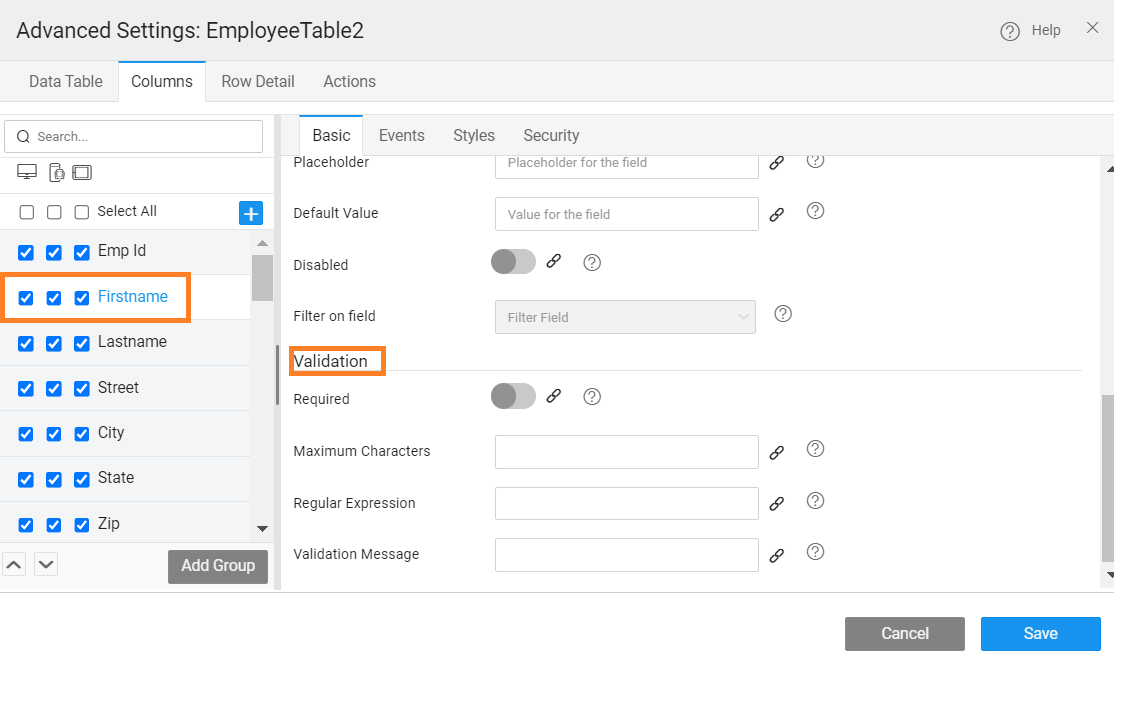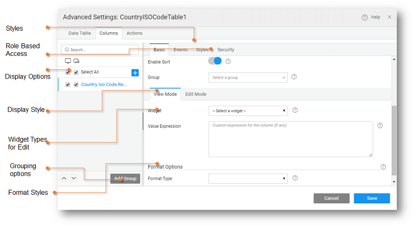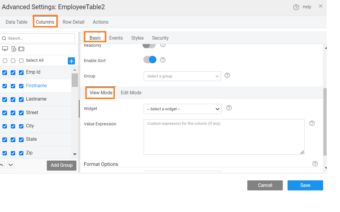 - Value Expression - You can write a custom expression to change the display setting for a table column. The expression needs to follow AngularJS conventions for binding. A sample expression is given which can be enhanced as per the needs of the application.