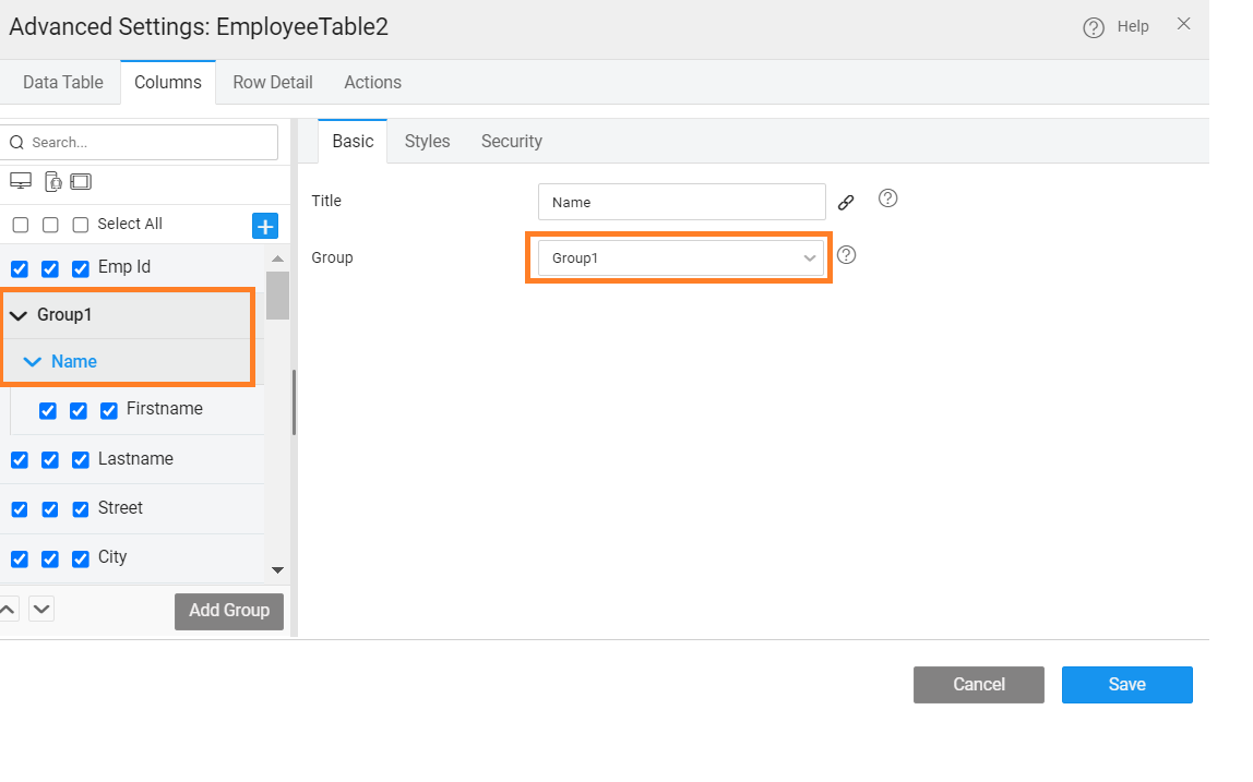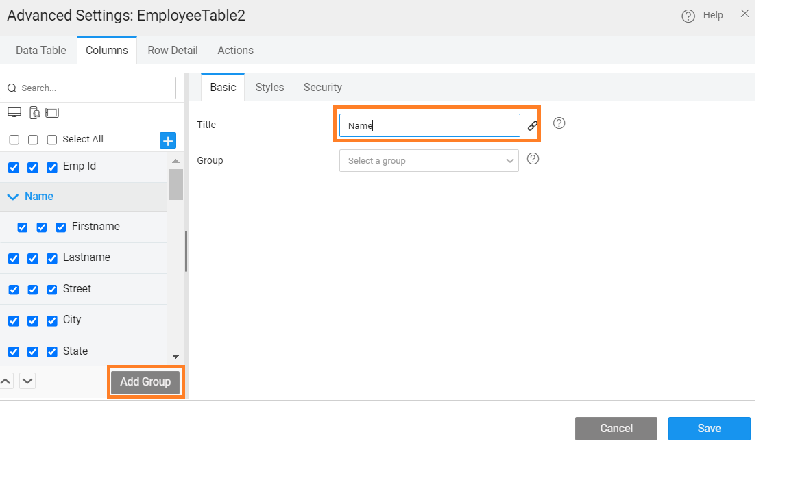 - Use the Add Group button under Columns tab of Advanced Settings. This will allow you to give a title to the group.