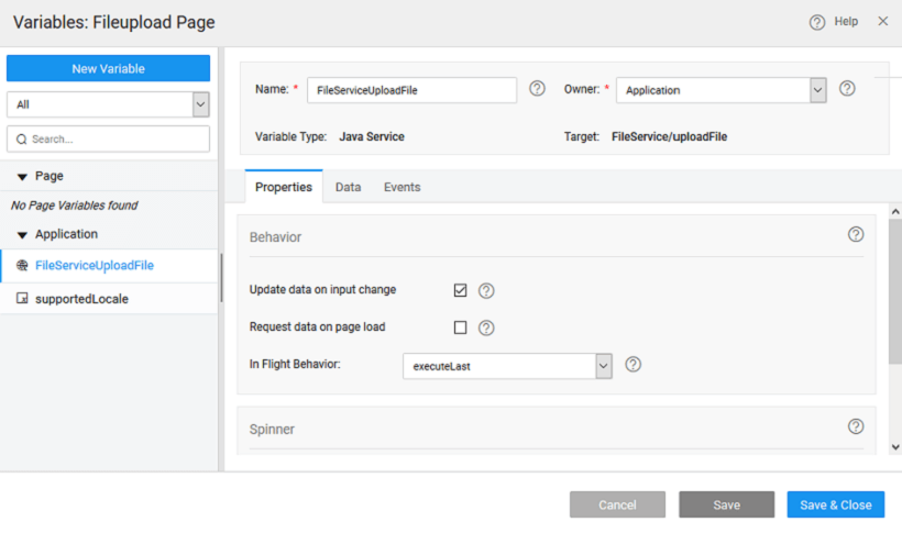 2. You will be prompted to create a FileServiceUploadFile Variable. For this demo purpose, retain the default selections of Update data on input change. NOTE: You can create and use any service, but keep in mind that the operation selected should be able to accept file data. The default file service uploadFile operation fulfills this requirement.