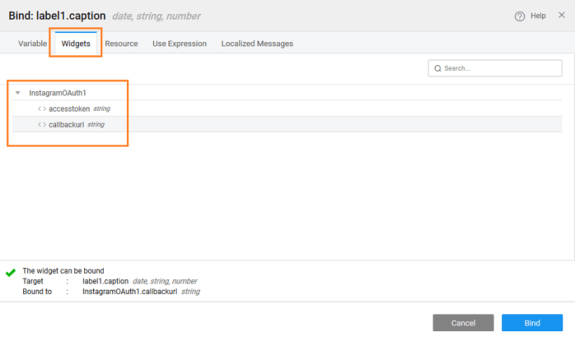 1. Drag and drop a Label onto the canvas. Click on bind icon against the label caption property to the callbackurl property of the Instagram OAuth Prefab.
