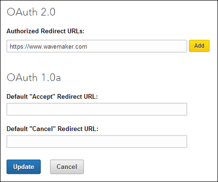 4. Enter a valid sample Authorized Redirect URLs below OAuth 2.0 and click Add. Click Update. Your application is successfully created. Note: Make a note of the Client ID and Client Secret