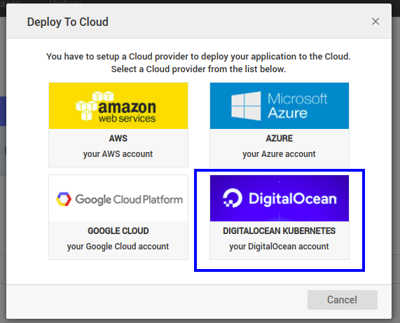 Demo phase uses WaveMaker's internal cloud. But the Stage and Live phases need to be configured to use your own AWS, Azure or GCP accounts. To this list of cloud providers to choose from, we are now adding Digital Ocean. This is the first Kubernetes based cloud provider supported by the WaveMaker Platform.