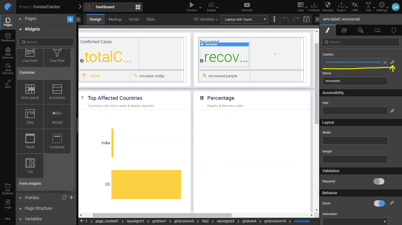 Apart from just binding the data to API response, WaveMaker enables writing simple expressions as shown below to compute data. f(n) = (totalRecovered * 100) / totalConfirmed gives the % recovery, alongside using other data formatting rules.