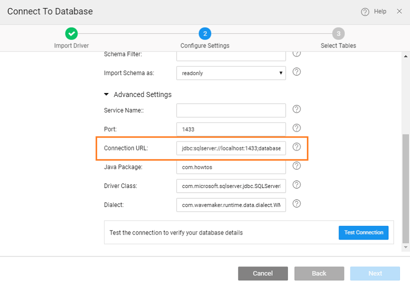 - Provide Azure SQL server details such as Host, User Name, Password and Database Name, Schema Filter (comma-separated list of schema names to import) in the configure settings step and click on ADVANCED SETTINGS button to review the generated connection url. Note: The mappings between the Azure MS SQL Server and WaveMaker are given in the next section.