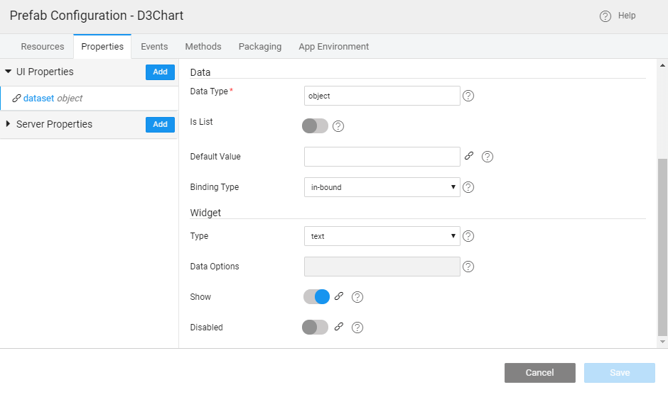 • Add Property - dataset with attributes Widget set to text, Type set to object (type it, if not selectable) and Bindable set to in-bound