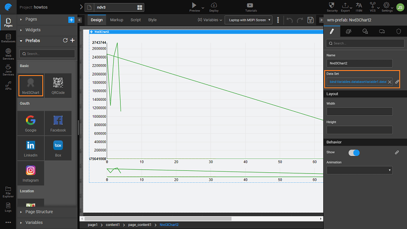 D3 allows you to bind arbitrary data to a Document Object Model (DOM), and then apply data-driven transformations to the document. For example, you can use D3 to generate an HTML table from an array of numbers. Or, use the same data to create an interactive SVG bar chart with smooth transitions and interaction. The chart widgets which are offered by WaveMaker are based out of NVD3 charts, which are re-usable charts for D3 charts. and as such implementing any of the NVD3 & D3 charts becomes easy. Here we will see two simple examples - line chart (D3) and line plus bar chart (NVD3).