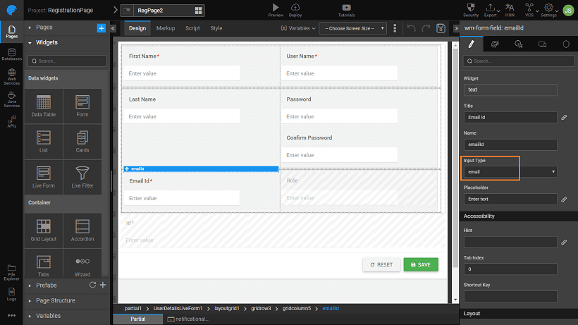 • For Email ID, set input Type to email. This will auto validate the field entry to be in the email format with an @ symbol.