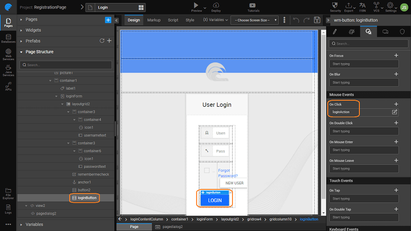 • Set the onClick event of the Sign In to loginAction. This will ensure that when any user logs in, the password is encrypted before checking it against the database by the login variable.