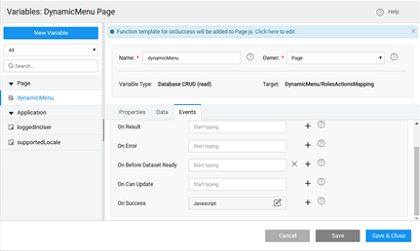- Navigate to the Events tab for the variable and choose JavaScript as the operation for the onSuccess event as below: