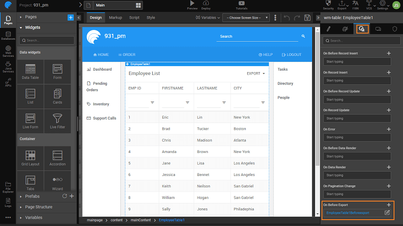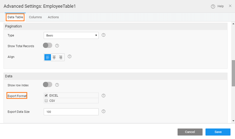 - You can further customize the data being exported using the on Before Export callback event of the Data Table.