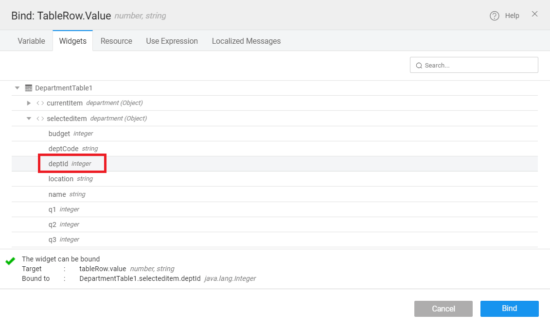 - Go to the Widgets tab → DepartmentTable → selecteditem → deptid integer → click Bind.