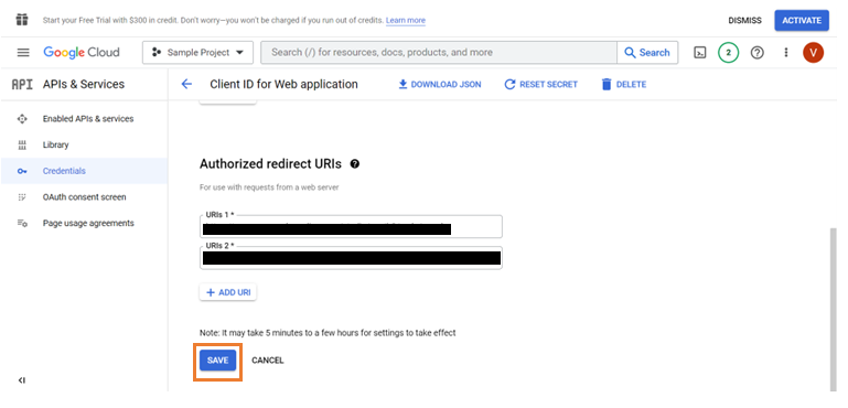 In the Credentials section, enter the Authorized redirect URIs and click Save.