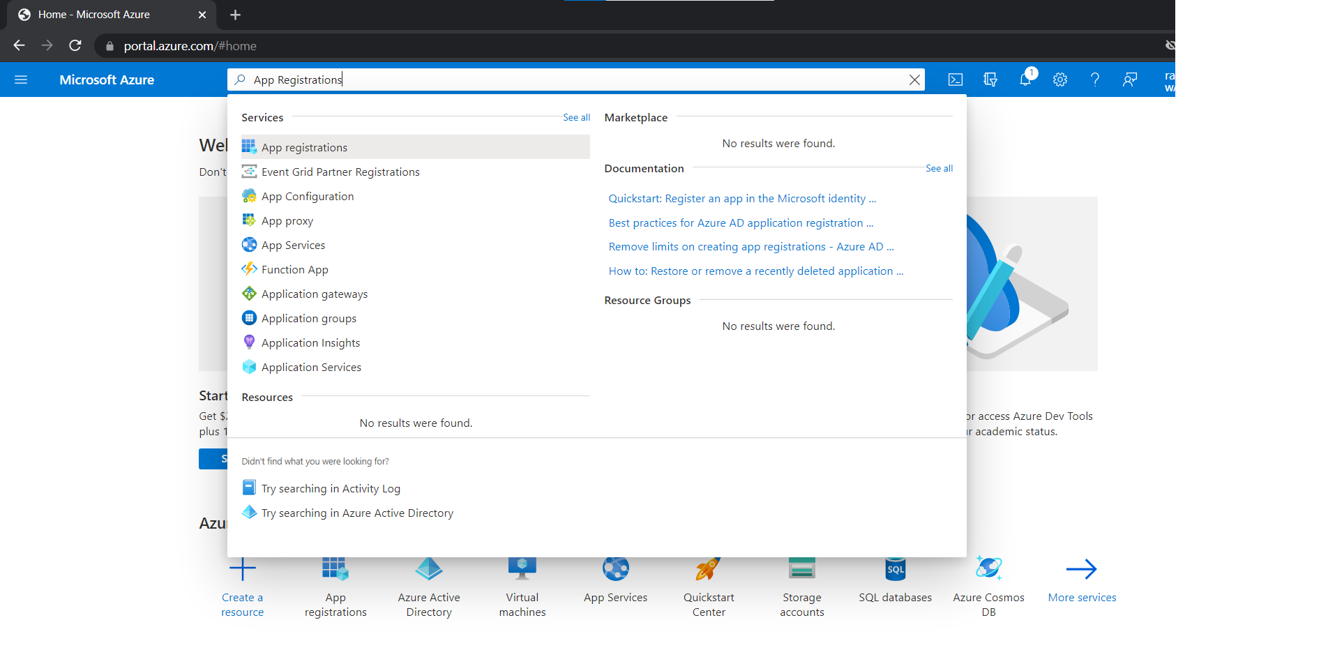 2. Search for App Registrations from the top navigation bar and click it.