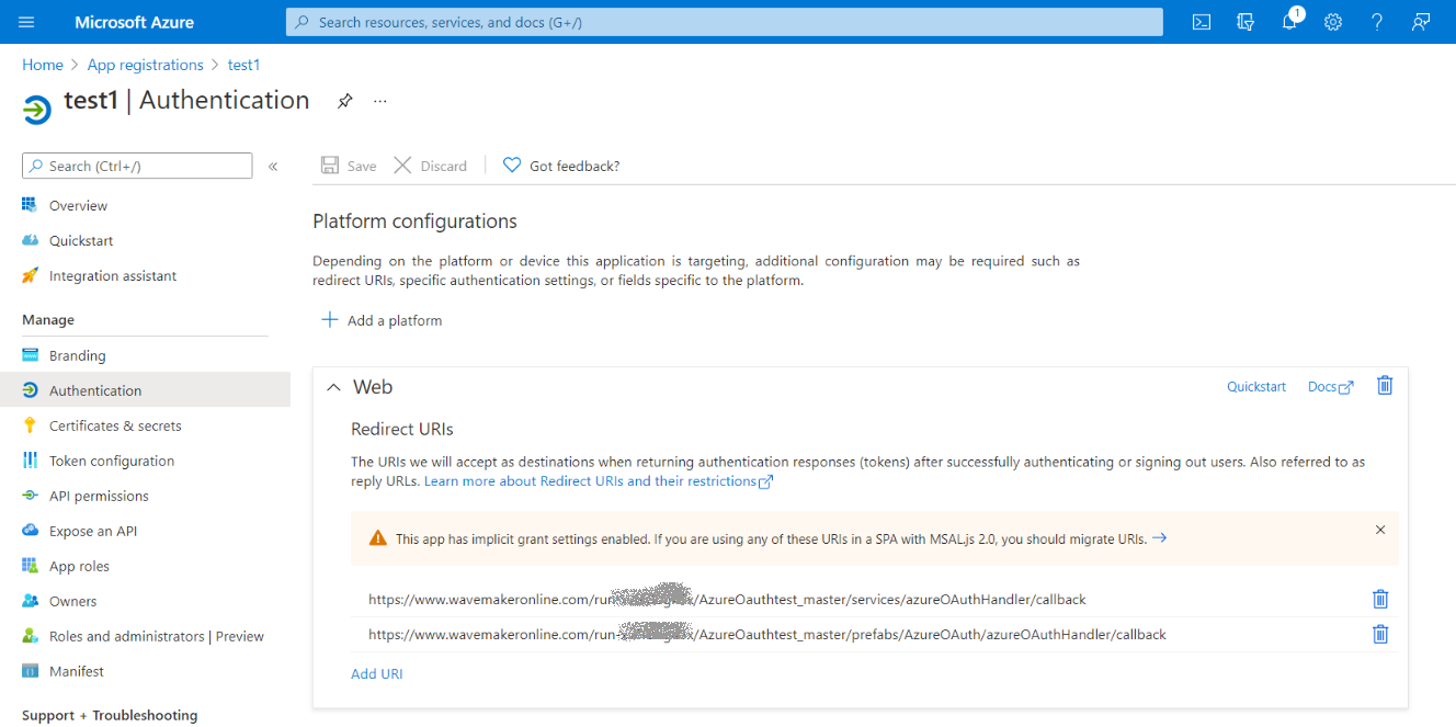 2. In the left panel under App Registration click Authentication and add redirect URIs as below.