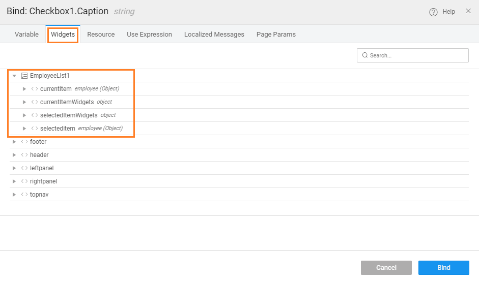 2. selecteditem & selectedItemWidgets: The selecteditem bind object can be used to capture the selected item of the list when selection is enabled for the List. The return type would be array in case of multi-select List. selecteditem and selectedItemWidgets can be accessed through the script as follows, the click of a button will capture the selected item firstname and the caption of widget Name: