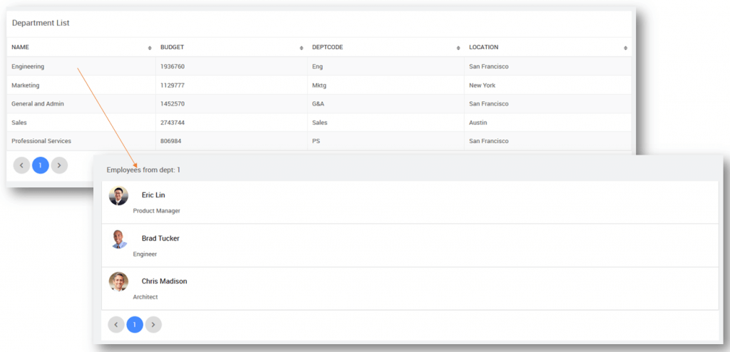 - Click event of the Department Data Table will trigger a call to the Employee page passing the
