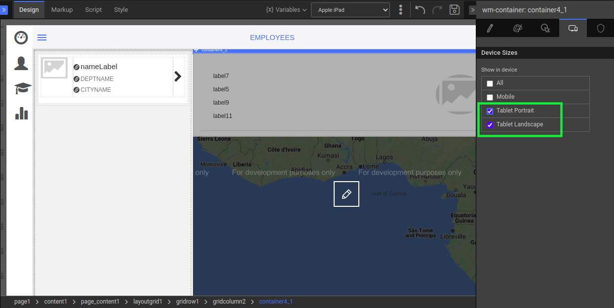 But this second column should be displayed only in tablet view. Therefore, configure this by setting the showindevice property to Tablet Portrait and Tablet Landscape.