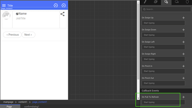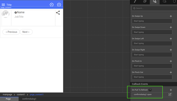 - Set an action to the Pull to Refresh event. For example, open a dialog as shown below.
