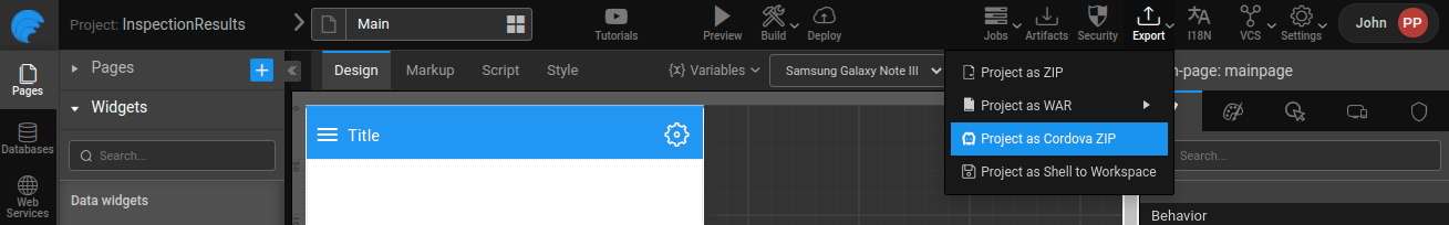 - In the top right menu bar of WaveMaker Studio, go to Export and click Project as Cordova ZIP.