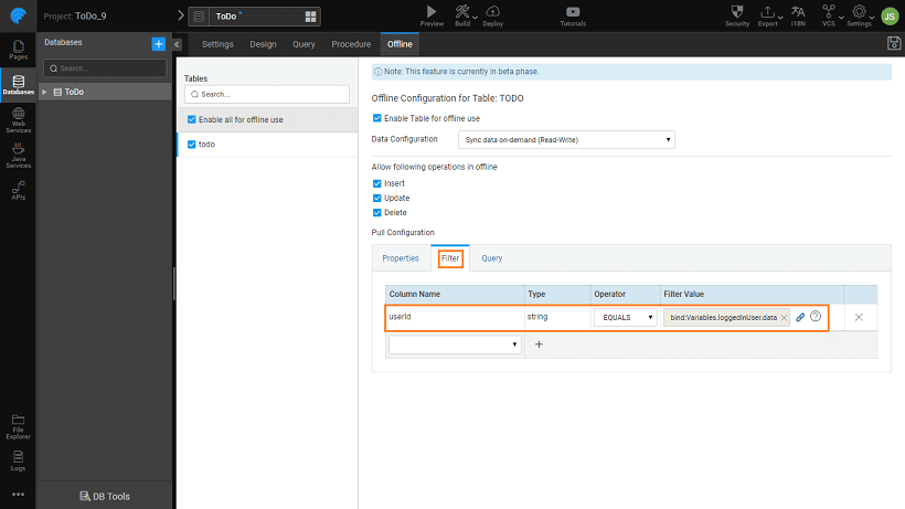 - Make TODO table to be available in offline. Pull only tasks belongs to the logged-in user during app startup. Save the configuration.