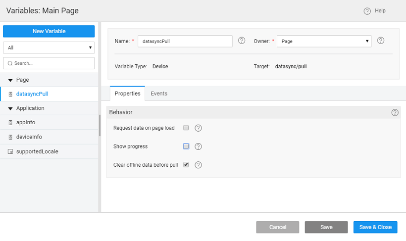 - Two variables, datasyncPush and networkInfo, are automatically created. With these variables in place, the app will push offline data changes whenever the mobile comes online.