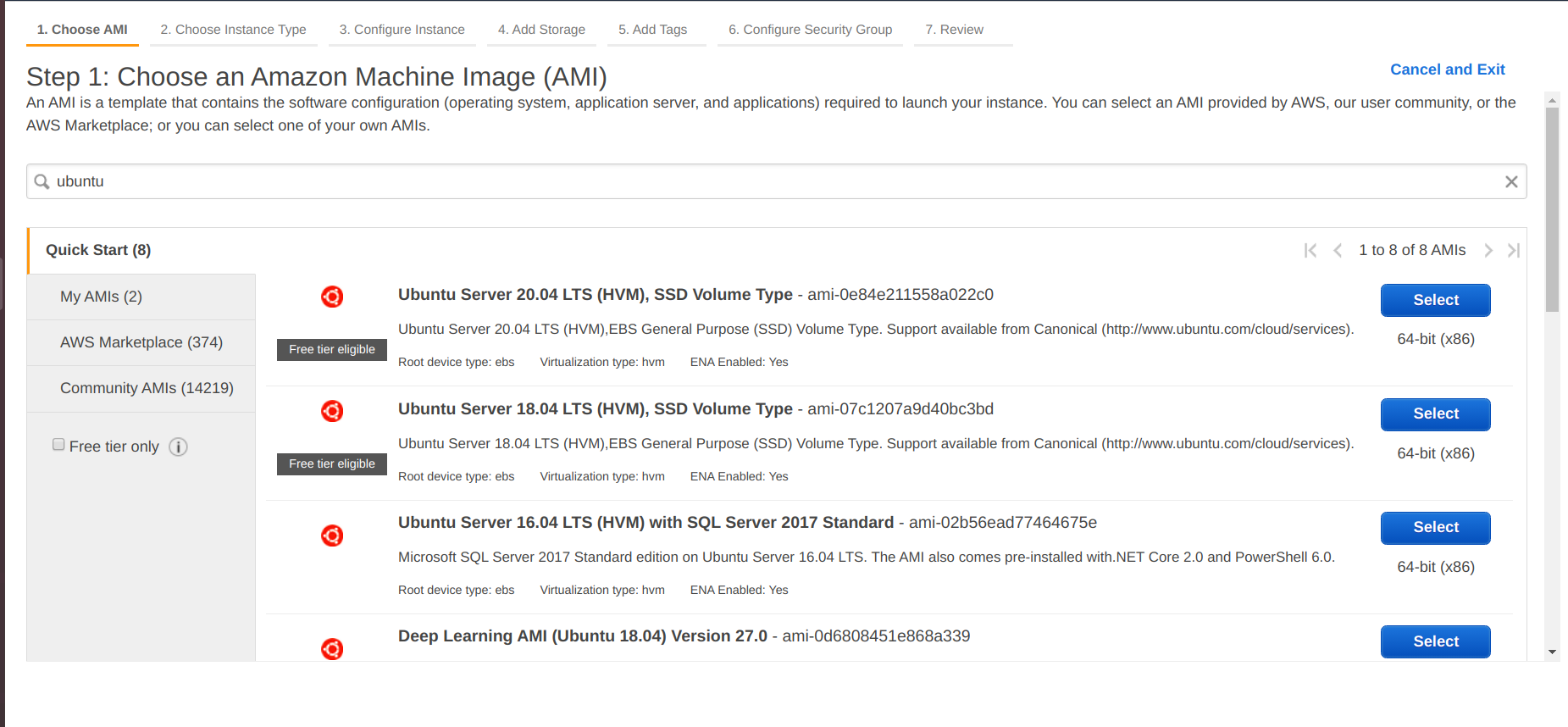 - Choose Launch Instance, choose an ubuntu 16.04 Amazon Machine Image (AMI), or if you have any ubuntu 20.04 AMI, select it.