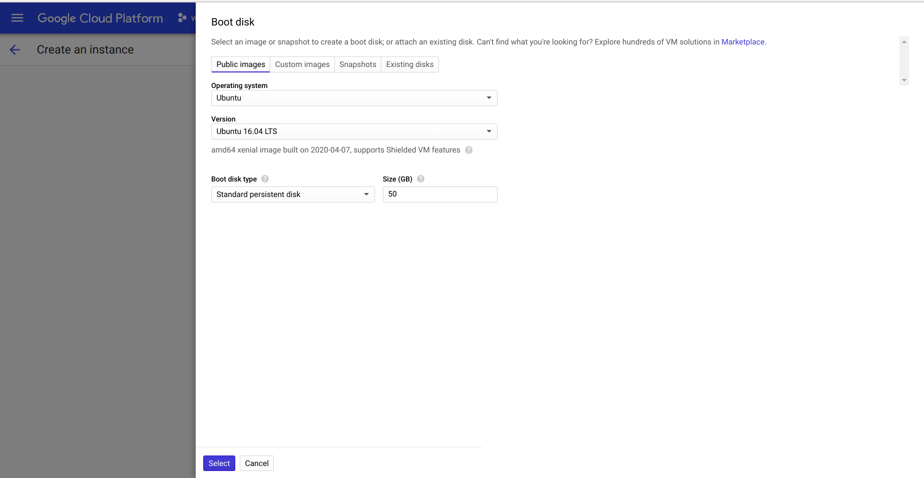 - Select image or snapshot for creating boot disk.select operating system as ubuntu and version as ubuntu 16.04 LTS.