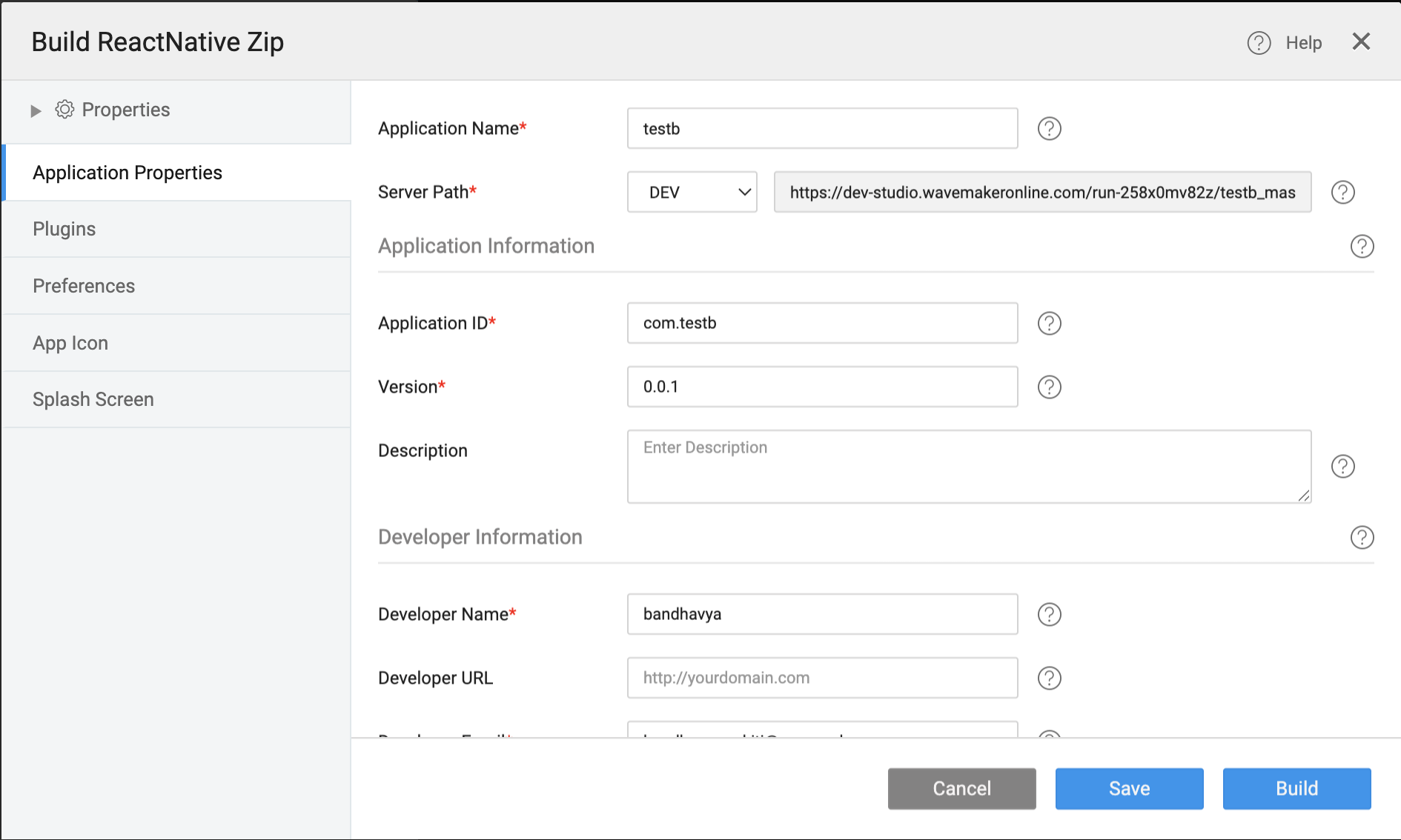 | Server Path | The backend server URL. Dev : Prepopulates the application preview URL. Custom : Allows you to specify the URL of hosted backend. It can be a deployed WaveMaker App, or your own backend. None : Select when the app has no backend dependency and should work offline. |
