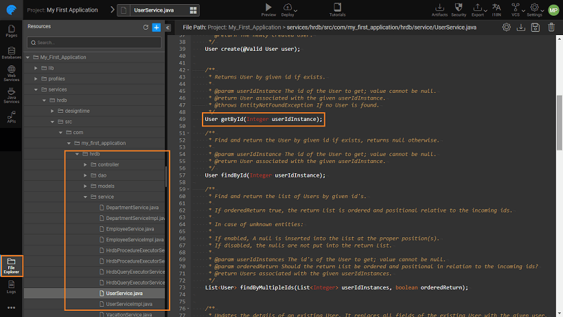 To access a database table from a Database Integrated into your app, you need to access the Java Service file corresponding to the table from the Services tab in the left panel. For example, to access the User table from hrdb, you need to access the UserService.java file from the services folder available under FileExplorer panel.