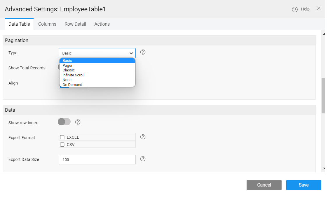 The user can Export the Data Table to an Excel or CSV format. This option is available only when the Data Source is a Variable based on database CRUD APIs or a Variable based upon a java service or depending on a query. 'Export Data Size' property on data table specifies the number of records to be exported. Based on the profile settings limit, records are fetched. If you specify an export data size value, records are fetched based on this value. By default, the value is set to 100, the maximum export size. To export more than 100 records, the max size in the profile needs to be changed from the Project Configurations menu of Project Workspace.