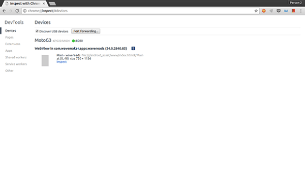 - On the desktop, open a chrome browser and go to ‘chrome://inspect#devices’. All available apps for debugging are shown on that page.